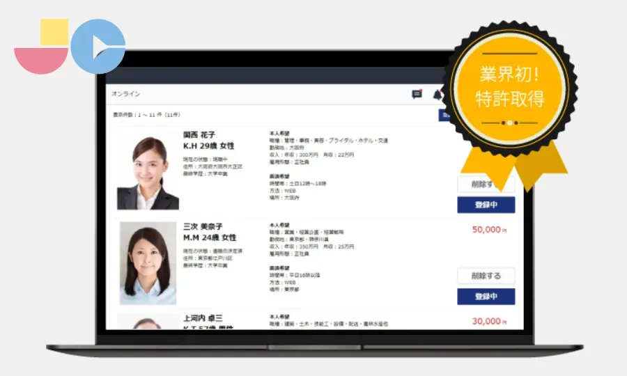 2つの方法で求職者を獲得できる次世代型リスティングでもあり、「面談確約求職者」の獲得、及びアライアンス対応で気になる求職者を確実に獲得可能。特許取得済みの業界初のスキームで、貴社の売上UPに貢献します。